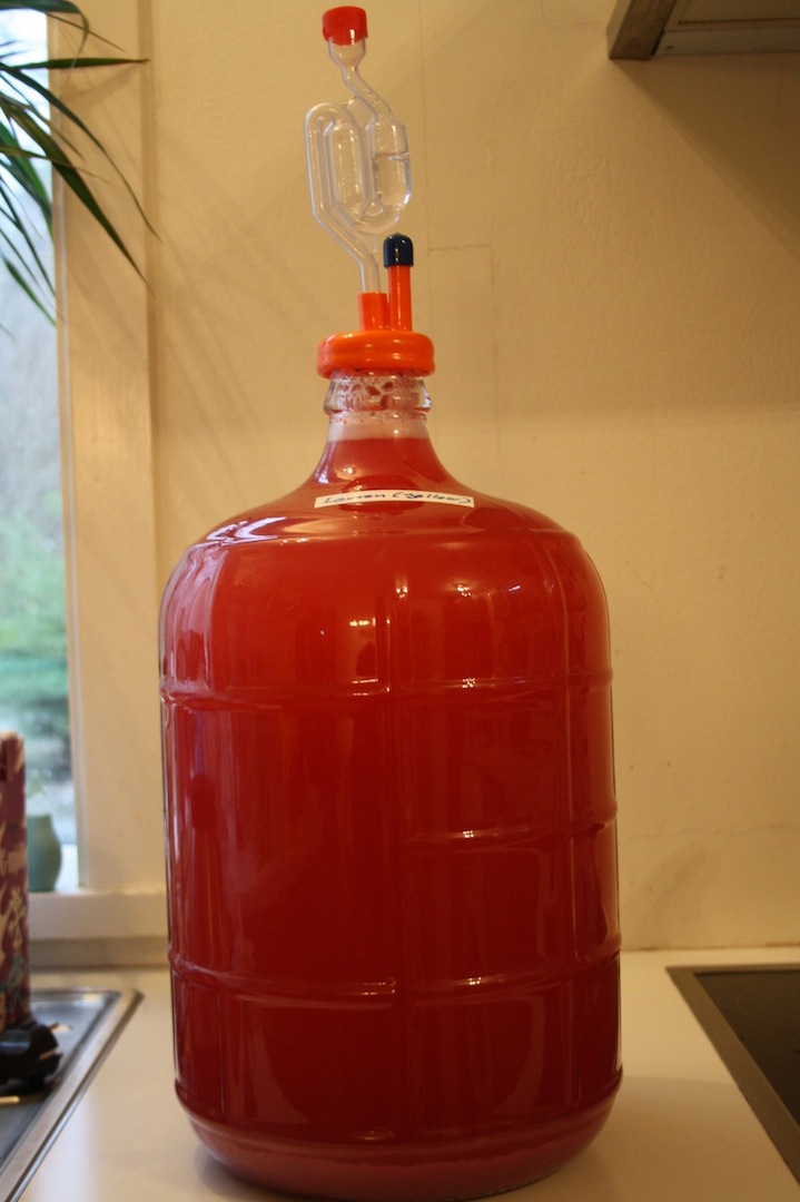 Regarding the color, in the picture it looks like red but it is more like a light pink color.. I followed the link in your post and did stick to the original recipe (as much as possible) so I used the yeast slurry from a batch of krækiber wine I was doing, therefore the color. I am expecting some combination of flavors too lets see..