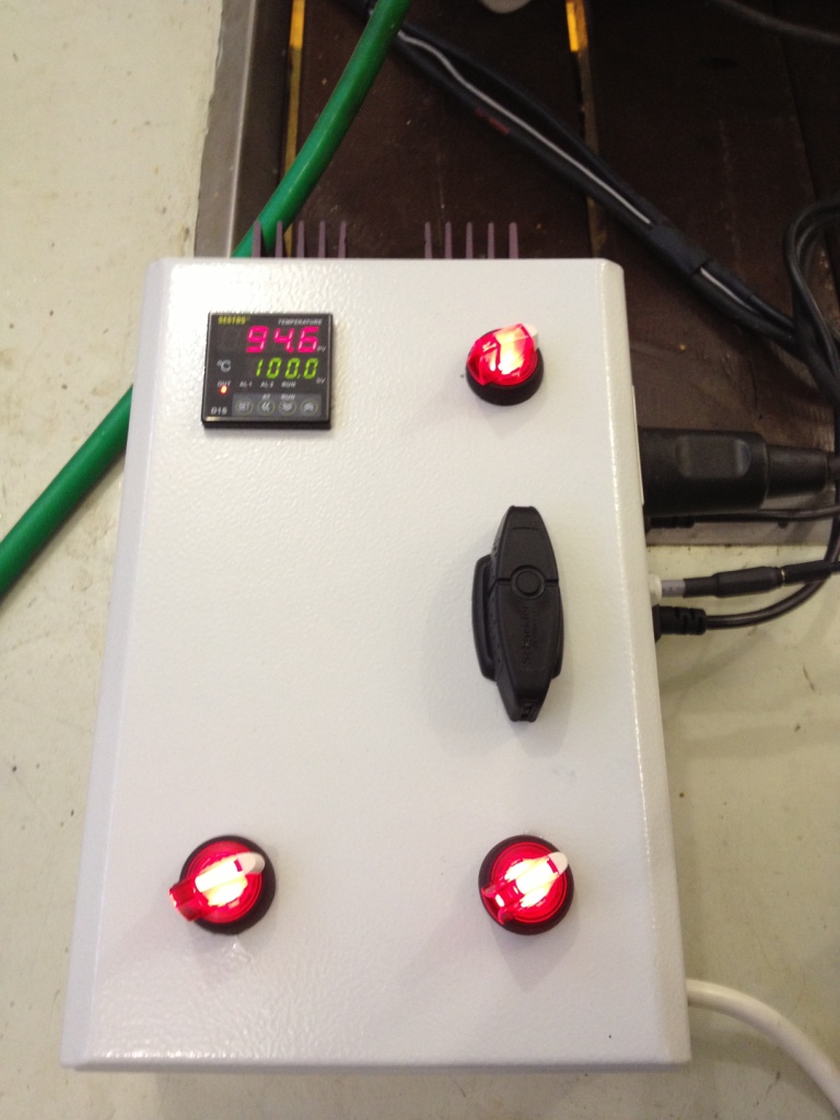 Svo smíðaði hann þetta líka flotta stjórnbox með PID og SSR auk rofa fyrir hvort element fyrir sig og dæluna. Það er enn nóg pláss í boxinu vilji maður bæta einhverju við.