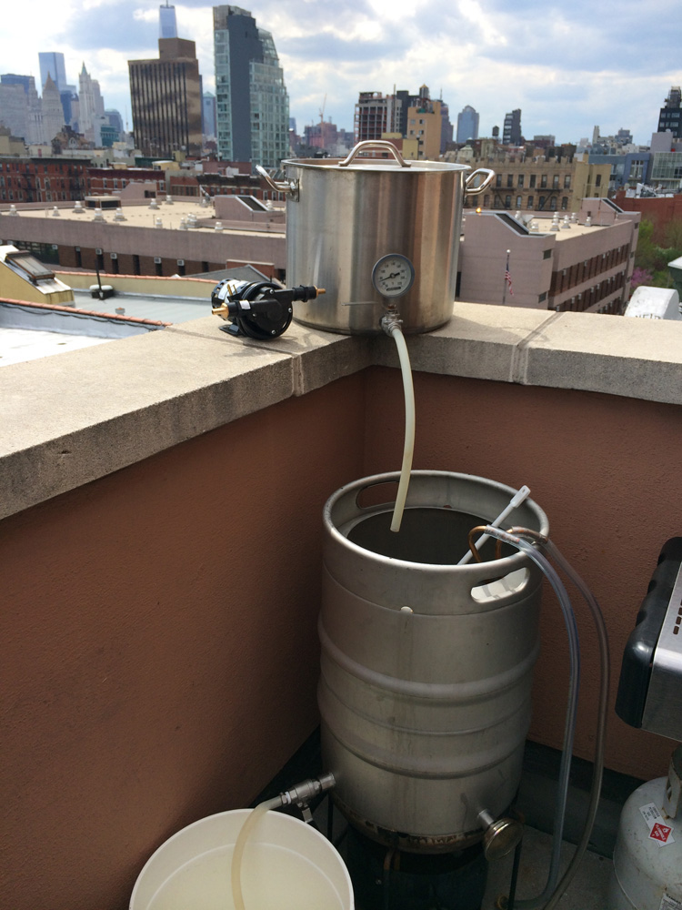 Þá röltum við af stað niður í East Village. Bruggarinn þar tók vel á móti okkur með espresso stout úr kegeratornum. Auk þess var hann með nokkrar tegundir á flöskum, s.s. rauchbier, piparbjór, súran hvítbjór og eitt og annað. Hann var með fína aðstöðu úti á svölum á 8. hæð. Flestir hérna brugga á gasi, meskja sérstaklega og hafa svo fötu með sparge vatni sem er látið renna yfir kornið í lokin. Þessu var komið haganlega fyrir á svölunum. Hann var meira að segja að gera tilraunir með að rækta sína eigin humla þar uppi. Það var gaman að sjá hvað báðir fyrstu bruggararnir lögðu mikið upp úr útliti á bjórunum sínum, gerðu flotta miða og fundu góð nöfn á þá. Þá voru flestir bruggararnir sem ég hitti með eigin heimasíður og nafnspjöld til að auglýsa þær.
