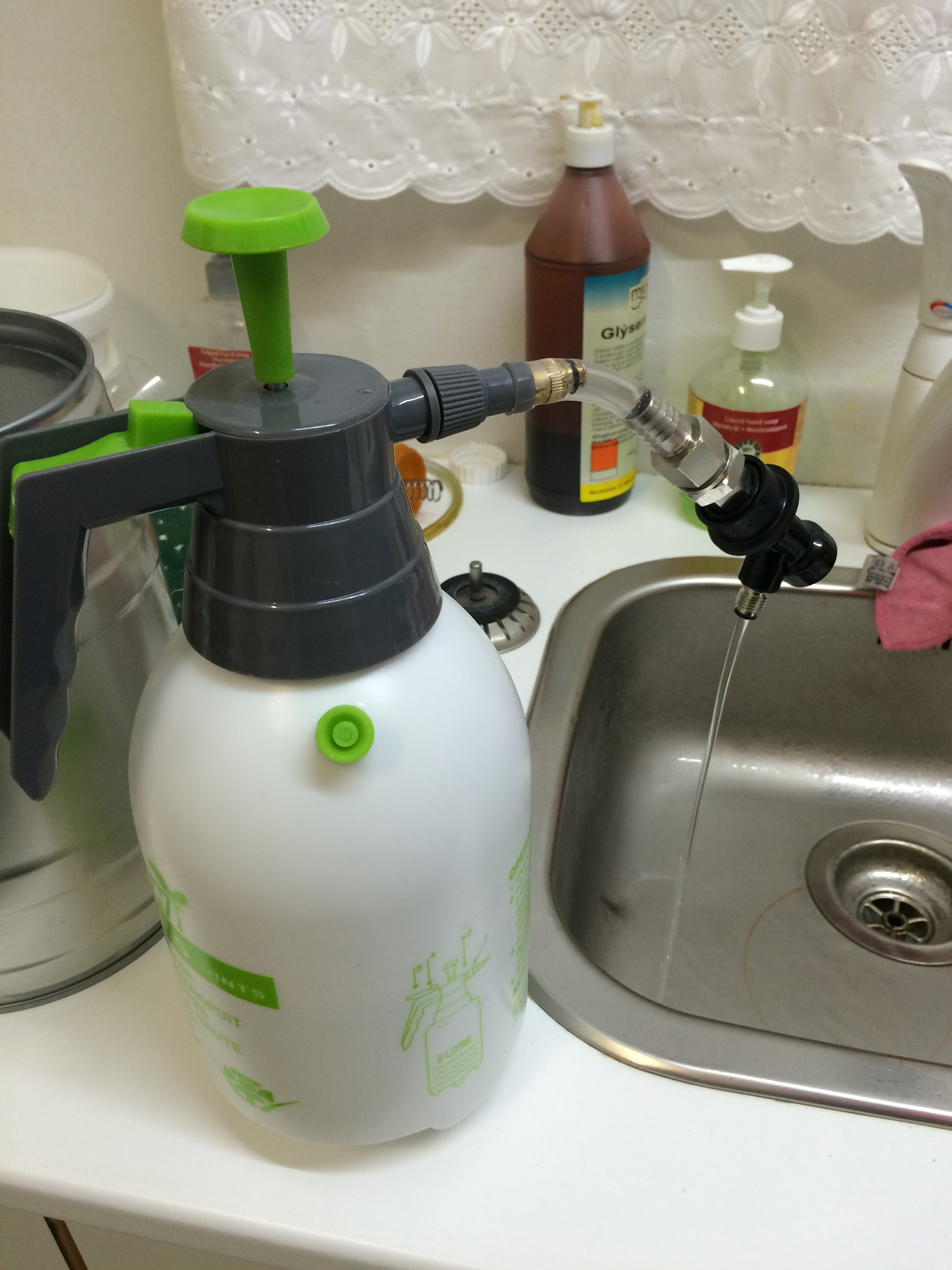 Hér er svo græjan í action. Til að nota græjuna er byrjað á því að fylla með vatni eða hreinisvökva, pumpað nokkrum sinnum. Þá er græjan tengd við svarta tengið á tækjunum sem á að hreinsa. Svo er vatni þrýst út með því að ýta á græna takkann á handfanginu. Á þessari könnu (og líklega flestum) er hægt að festa hann niður til að fá stöðugt rennsli.