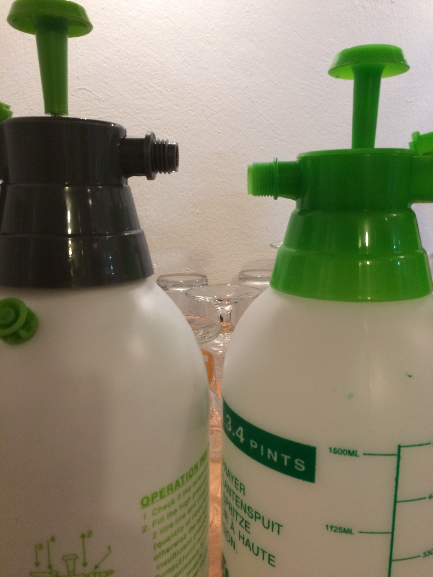 Eftir að ég kom heim skoðaði ég annan þrýstibrúsa sem ég á. Ég keypti hann í sumar í Blómavali á svipuðu verði og sá sem ég fékk í Verkfæralagernum en notaði við eitrun í garðinum og því vildi ég ekki nota hann í þetta verkefni. Sá sem ég keypti í dag er til vinstri, sá eldri til hægri. Sá eldri er með mun álitlegri skrúfgangi, þ.e. ekki eins grófum. Með grófur þá á ég við fjöldi snúninga á lengd. Sá til hægri er með mun fínni skrúfgang og því vænlegri til árangurs ef finna á beint millistykki milli þeirra. Ég myndi því skoða skrúfganginn vandlega á brúsanum ef þið ákveðið að fara út í svona framkvæmd.