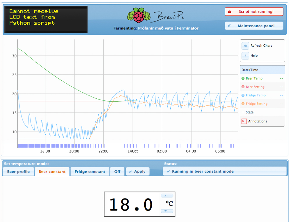 Ég tók gerjunarskápinn á næsta level með BrewPi hitastýringu sem tengist í web server á Raspberry Pi. Það er hægt að stjórna hitastiginu, fylgjast með og logga alla gerjunarsöguna beint frá tölvunni minni eða símanum.
